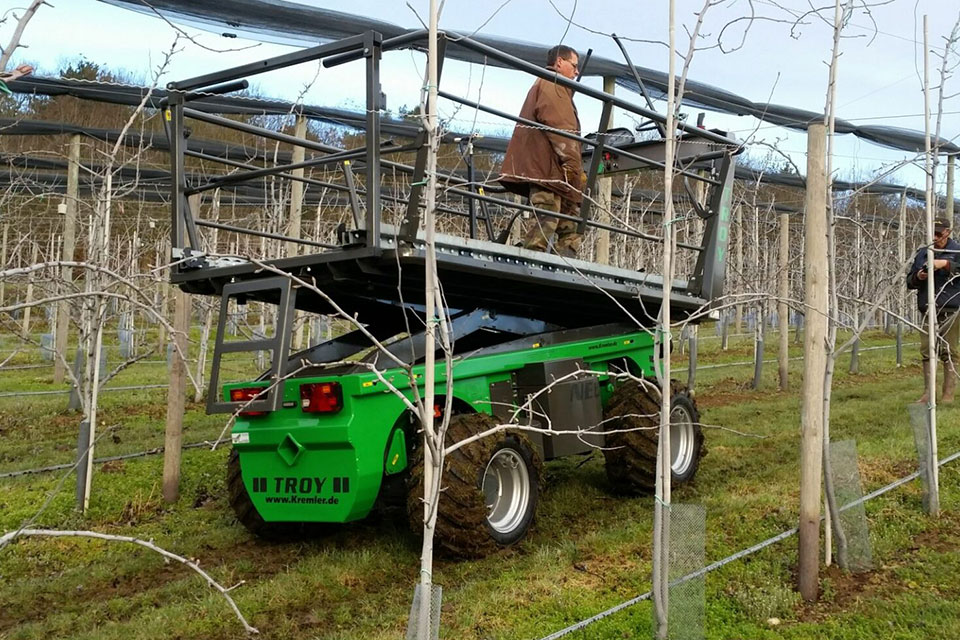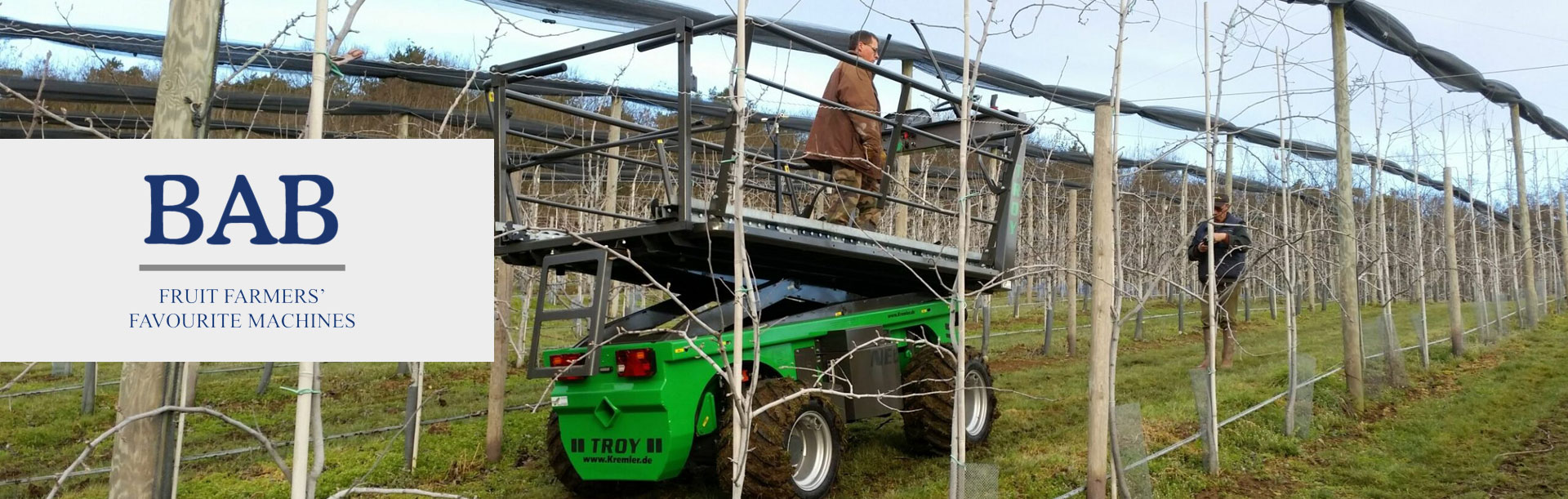 BAB BAMPS verfügt über eine umfangreiche Produktpalette, die von Mähern und Sprühgeräten bis hin zu Obstverarbeitungsmaschinen reicht. Der belgische Hersteller baut Maschinen nach den neusten technischen Standards. Bei der Jakob Hofer AG können Sie die Arbeitsbühne «Troy» von BAB mieten, Probe fahren und kaufen. Dank dem automatischen Hangausgleich ermöglicht die Arbeitsbühne in jedem Gelände ein sicheres und angenehmes Arbeiten.